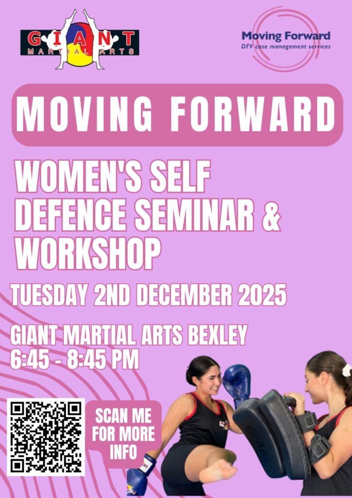 The event @ GIANT on Tuesday 2nd December @ 6:45pm in place of the regular Women’s Only timeslot. Students who normally attend that class are welcome to bring a female friend that can benefit from this specific self defence specific workshop. There is no cost for the workshop, however we kindly ask for a donation to Moving Forward at reception upon arrival.